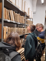 Najpierw wszyscy udali się do Archiwum Państwowego w Łowiczu, by wysłuchać wykładu pani Anny Chmielewskiej – kierownik Archiwum Państwowego. Dowiedzieli się, że w zbiorach Archiwum Państwowego w Łowiczu znajdują się głównie materiały aktowe, które dotyczą Łowicza i obecnego powiatu łowickiego. Uczniowie mieli też okazję obejrzeć archiwalne materiały dotyczące szkoły na Blichu oraz zobaczyli obszerny magazyn, w którym zgromadzona jest dokumentacja historyczna.